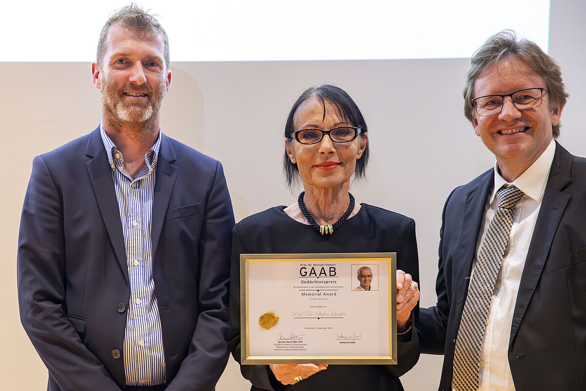 Eine bedeutende Auszeichnung für den Direktor der Klinik für Neurochirurgie an der Klinikum Bayreuth GmbH: In diesen Tagen erhielt Prof. Dr. Stefan Linsler am Universitätsklinikum des Saarlands in Homburg den Gaab-Gedächtnispreis für Innovationen in der endoskopischen Neurochirurgie. Der Preis erinnert an Prof. Dr. Michael Gaab, der als Mitbegründer der Neuroendoskopie in Deutschland und Europa gilt und im vergangenen Jahr verstorben war. Die Auszeichnung geht an Persönlichkeiten, die das Lebenswerk und die ersten Entwicklungen der Neuroendoskopie von Prof. Gaab weitergeführt und wissenschaftlich etabliert haben. Prof. Dr. Linsler nahm den Preis aus den Händen von Monika Gaab, der Wiwe des verstorbenen Mediziners, und von Prof. Dr. Joachim Oertel, Klinikdirektor Neurochirurgie am Universitätsklinikum des Saarlandes und Schüler von Prof. Gaab, entgegen.