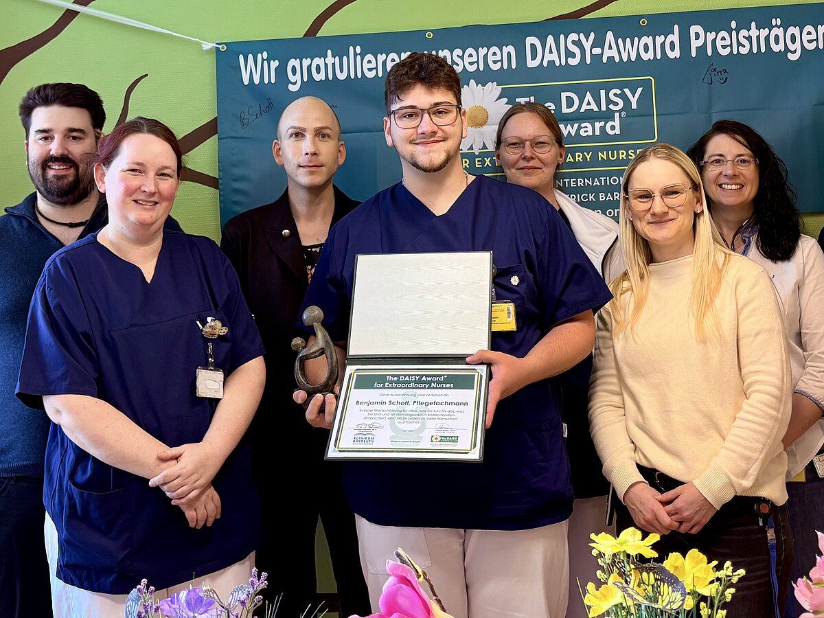 Der DAISY Award für den Monat März geht an Benjamin Schott, Pflegefachmann auf Station 15 am Klinikum. Bereits zum fünften Mal würdigt die Pflegedirektion der Klinikum Bayreuth GmbH herausragende Pflege. Für den DAISY Award können Pflegekräfte oder Hebammen von Patientinnen und Patienten, Angehörigen, Freundinnen und Freunden sowie von Mitarbeitenden nominiert werden.
