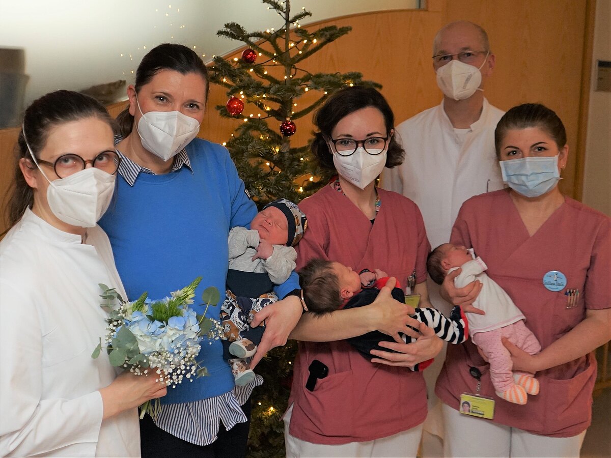 1333 Kinder kamen im vergangenen Jahr 2022 im Klinikum Bayreuth zur Welt, nur sechs weniger als im Jahr davor. Darunter waren 23 Zwillingspärchen. Für Prof. Dr. Christoph Mundhenke, Direktor der Frauenklinik, ein gutes Jahr: „Wir haben auch im vergangenen Jahr keinen Einbruch bei den Geburten erlebt. Im Vergleich zum bundesweit rückläufigen Trend bleiben wir stabil. Und wir planen weiter zu wachsen, und die Geburtshilfe und das Perinatalzentrum Level 1 weiterzuentwickeln.“ Auf dem Bild (v.l.n.r.) Dr. Agne Ozalinskaite, Oberärztin der Frauenklinik, die Hebammen Michaela Limmer, Stefanie Much und Svitlana Sholik mit Lara, Theo und Aaron sowie Prof. Dr. Christoph Mundhenke, Direktor der Frauenklinik.