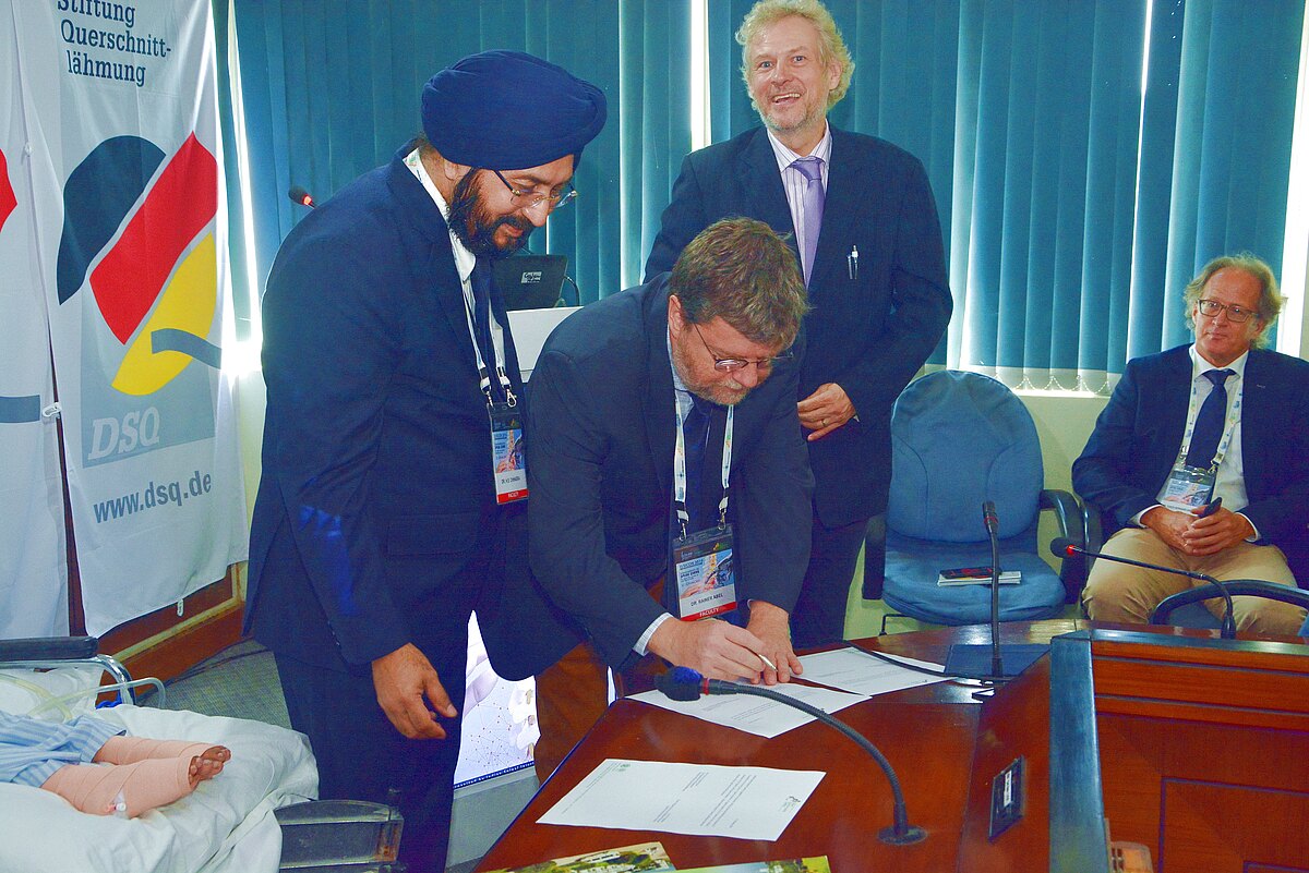 Dies wurde auch bei der Spendenübergabe, die jetzt in New Dehli stattfand, deutlich. Die beiden Kinder, deren weitere Behandlung jetzt sichergestellt ist, waren dabei. Sie hatten Verletzungen des Rückenmarkes im Halsbereich erlitten. Mit Hilfe der Spende wird jetzt versucht, die dauernde Beatmung abzubauen. Vertreter der Deutschen Botschaft in Indien haben die Vertreter der Deutschen Stiftung Querschnittlähmung maßgeblich unterstützt. Und auch einer der ranghöchsten Politiker Deutschlands schob mit an: Bundestagspräsident Dr. Wolfgang Schäuble gehört dem Kuratorium der Deutschen Stiftung Querschnittlähmung an.