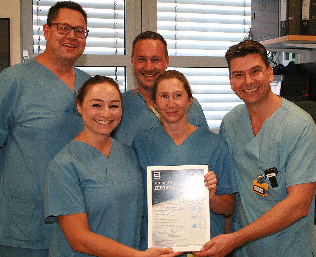 Prof. Dr. Christian Stumpf (links) und sein Team von der Klinik für Kardiologie, Angiologie und Internistische Intensivmedizin freuen sich über diese Auszeichnung: Die Klinik ist jetzt anerkanntes Zentrum für perkutane Mitralklappenrekonstruktion. Ein interventionelles Verfahren, das vor allem älteren Patientinnen und Patienten und solche mit einem erhöhten Operationsrisiko hilft.