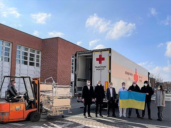 Montag, 28. Februar: Das Projekt läuft. Die Technische Abteilung gleicht unsere Lagerbestände mit der Anforderungsliste ab – und wird fündig. Untersuchungsleuchten und Ultraschallgeräte mit Schallköpfen können wir beisteuern. „Wir prüfen die Geräte nochmal durch, packen Betriebsanleitungen und Verbrauchsmaterial dazu“, heißt es von dort. „Wir brauchen einen halben Tag.“ Der Geschäftsbereich 7 Service bietet 20 Betten an, wir nehmen gerne an. Was können wir sonst noch tun? Na klar, uns um unsere Beschäftigten kümmern. Sechs Kolleginnen haben ukrainische Staatsbürgerschaft, wie viele diese Nationalität vor einer Einbürgerung mal hatten, können wir leider nicht feststellen. Wir wollen hören, ob und wie wir die Kolleginnen unterstützen können. Und organisieren ein Treffen mit ihnen.
