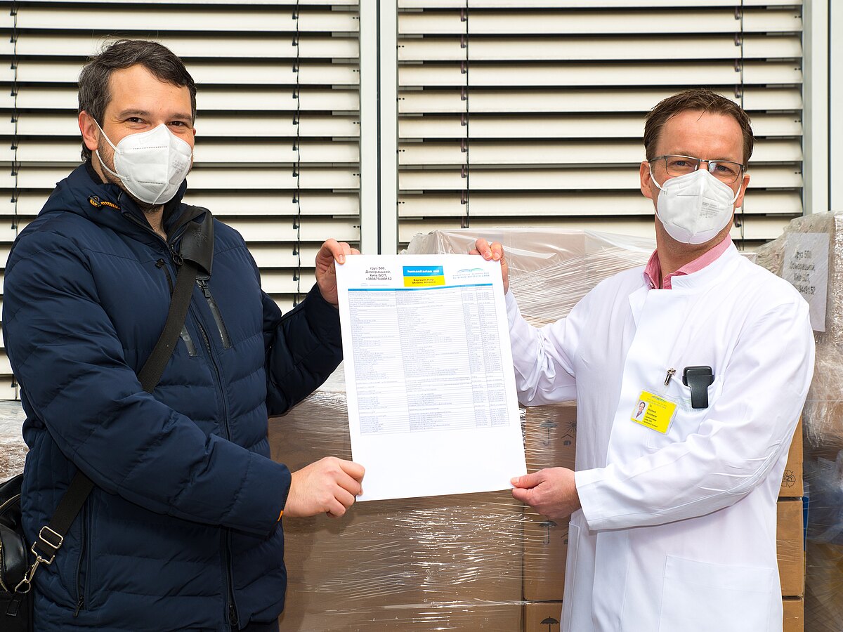 Freitag, 25. Februar: Eine E-Mail von Nicolai Teufel. Er ist wissenschaftlicher Mitarbeiter an der Uni, seine Mutter arbeitet bei uns, er hat beruflich, verwandtschaftlich und privat enge Beziehungen in die Ukraine. Er will helfen und dafür braucht er Hilfe. Seine freundliche Mail enthält eine Liste mit medizinischen Geräten, die in der Ukraine dringend gebraucht werden. Das weiß er aus erster Hand. Minuten später hat er eine Antwort von uns: Wir kümmern uns umgehend. Am Abend spricht er bei einer Kundgebung auf dem Marktplatz. Sagt auch, dass er sich über unsere Reaktion gefreut hat.