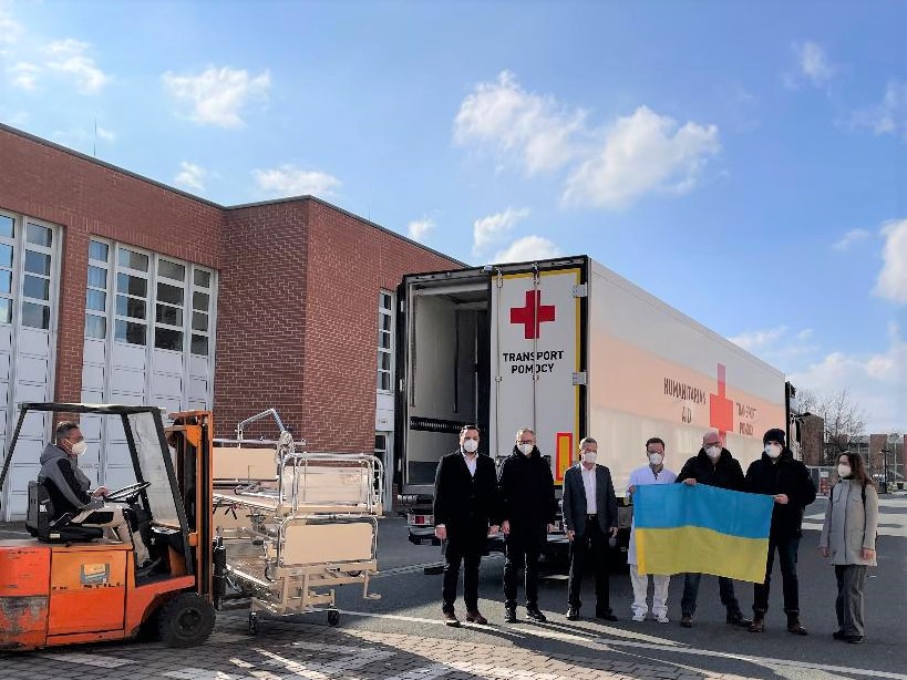 Freitag, 4. März: Am Morgen ruft Dr. Richard Sommerer, Leiter unserer Apotheke an. Er bietet zwei Paletten mit Infusionslösungen, Desinfektionsmittel und anderen Verbrauchsmaterialien für die Notversorgung an. Passt das noch in den Laster, der am Mittag die Betten und Geräte abholt? Bestimmt, wir packen. Pünktlich um 13 Uhr trifft der Sattelzug auf dem Wirtschaftshof ein und wird beladen. Geschäftsführer Prof. Raab und Richard Sommerer treffen sich vor Ort mit den Vertretern der BT Ukraine Help Alliance. Es findet alles Platz, der LKW rollt vom Hof in Richtung polnisch-ukrainische Grenze.