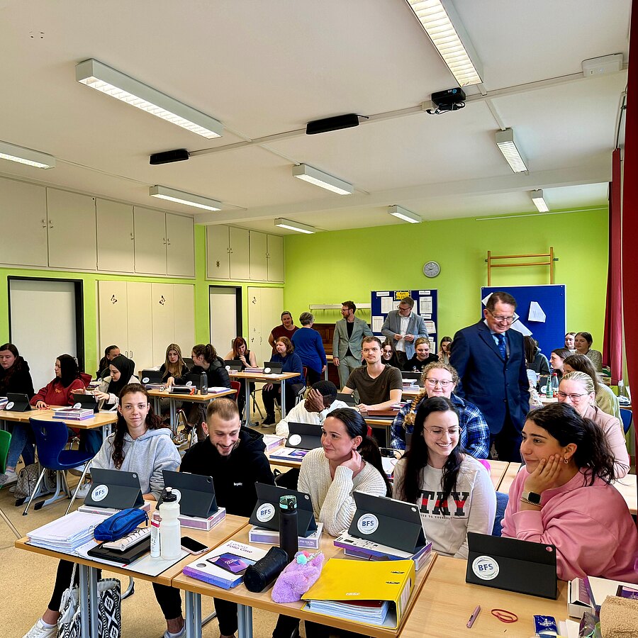 „Wie viel Papier brauchen wir noch?“ Mit diesen Worten begrüßte Klinikum-Geschäftsführer Dietmar Pawlik die Schülerinnen und Schüler der Berufsfachschule für Pflege bei der Übergabe der neuen Tablets. Die mehr als 50 angehenden Pflegekräfte nutzen die Tablets im Unterricht, zum selbstständigen Lernen aber auch in ihrer Freizeit. Nach Meinung des Krankenhaus-Geschäftsführers und der Pflegedirektorin, Franziska Maidorn, ist es wichtig, den Umgang mit digitalen Technologien in den Alltag einzubauen, insbesondere vor dem Hintergrund der fortschreitenden Digitalisierung in Kliniken. Aber bedeutet das, dass wir komplett auf Papier verzichten können?, fragte Pawlik. Nein: Die digitale Welt ist zwar praktisch und effizient, aber ohne die analoge Welt funktioniert sie nicht. Deshalb setzen wir in unserem Krankenhaus auf eine Kombination aus beidem: Wir nutzen digitale Tools zur Unterstützung unserer Arbeit, schätzen aber den persönlichen Kontakt und das Miteinander.