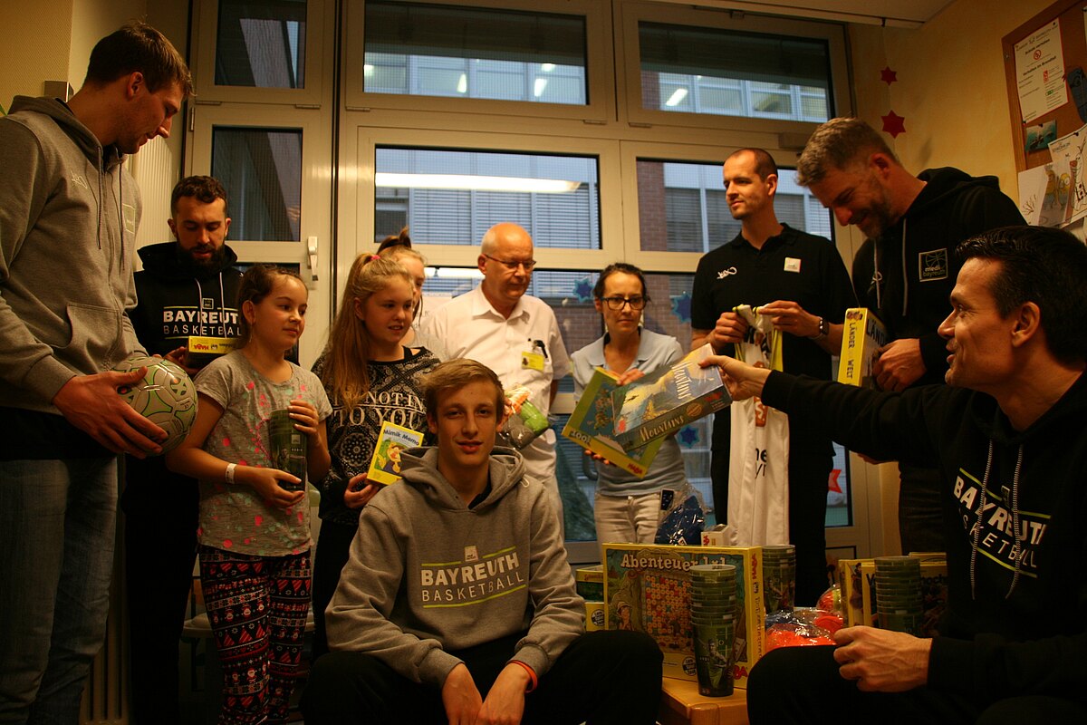 Die Bundesliga-Basketballewr von medi Bayreuth haben ein großes Herz für Kinder: Kurz vor Weihnachten besuchten Head-Coach Raoul Korner , die Spieler Basti Doreth, Lukas Meisner, Nico Wenzl und Steve Wachalski und Tomas Kanovsky, Leiter Marketing & Vertrieb & Hospitality, Kinder in der Klinik für Kinder und Jugendliche der Klinikum Bayreuth GmbH. Was sie mitgebracht hatten: jede Menge Spielzug des medi-Sponsors Haba und ein paar Überraschungen. Das Weihnachtstrikot von Steve Wachlaksi, das es nur ein einziges Mal gibt, wird nach den kommenden Spielen versteigert. Den Erlös wird das Team der Kinderklinik spenden. Und medi lädt 100 Kinder nach deren Genesung zu einem Heimspiel ein. „Für uns spielt der soziale Gedanke eine große Rolle“, sagte Tomas Kanovsky. „Wir möchten gerne eine langfristige Verbindung zur Klinikum Bayreuth GmbH aufbauen.“ Leitender Oberarzt Dr. Wolfgang Pohl und Erzieherin Ilona Golla informierten die Basketballer über die Klinik.