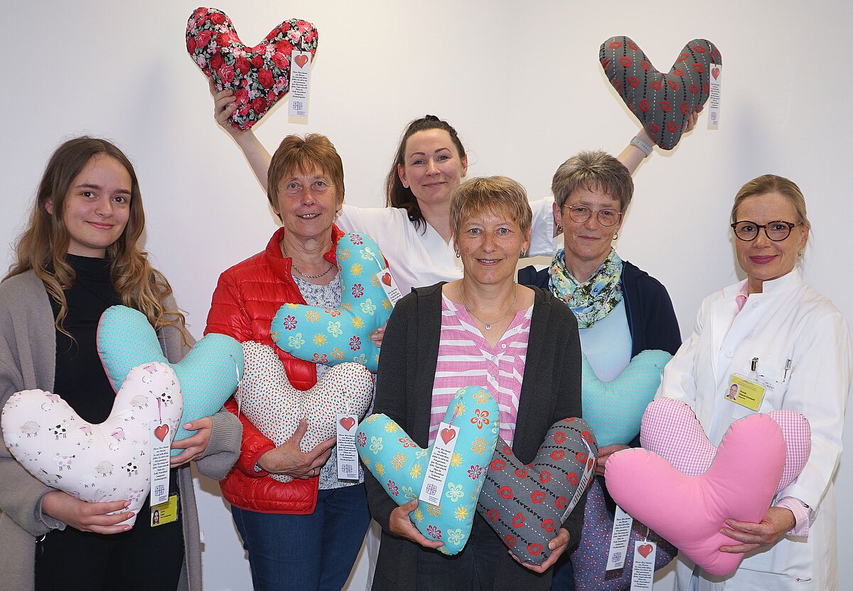Da steckt viel Arbeit und viel Liebe drin: 56 Herzkissen für Brustkrebspatientinnen des Brustzentrums der Klinikum Bayreuth GmbH haben Helga Rieger und Elisabeth Panzer vom Katholischen Deutschen Frauenbund Kirchenpingarten genäht. Oberärztin Svenja Dietzel-Drentwett und die beiden Medzinischen Fachangestellten Isabell Coppolelli und Laura Link sind begeistert: „Die Kissen sind genau so, wie die Patientinnen sie brauchen. Und sie sind wunderschön.“
