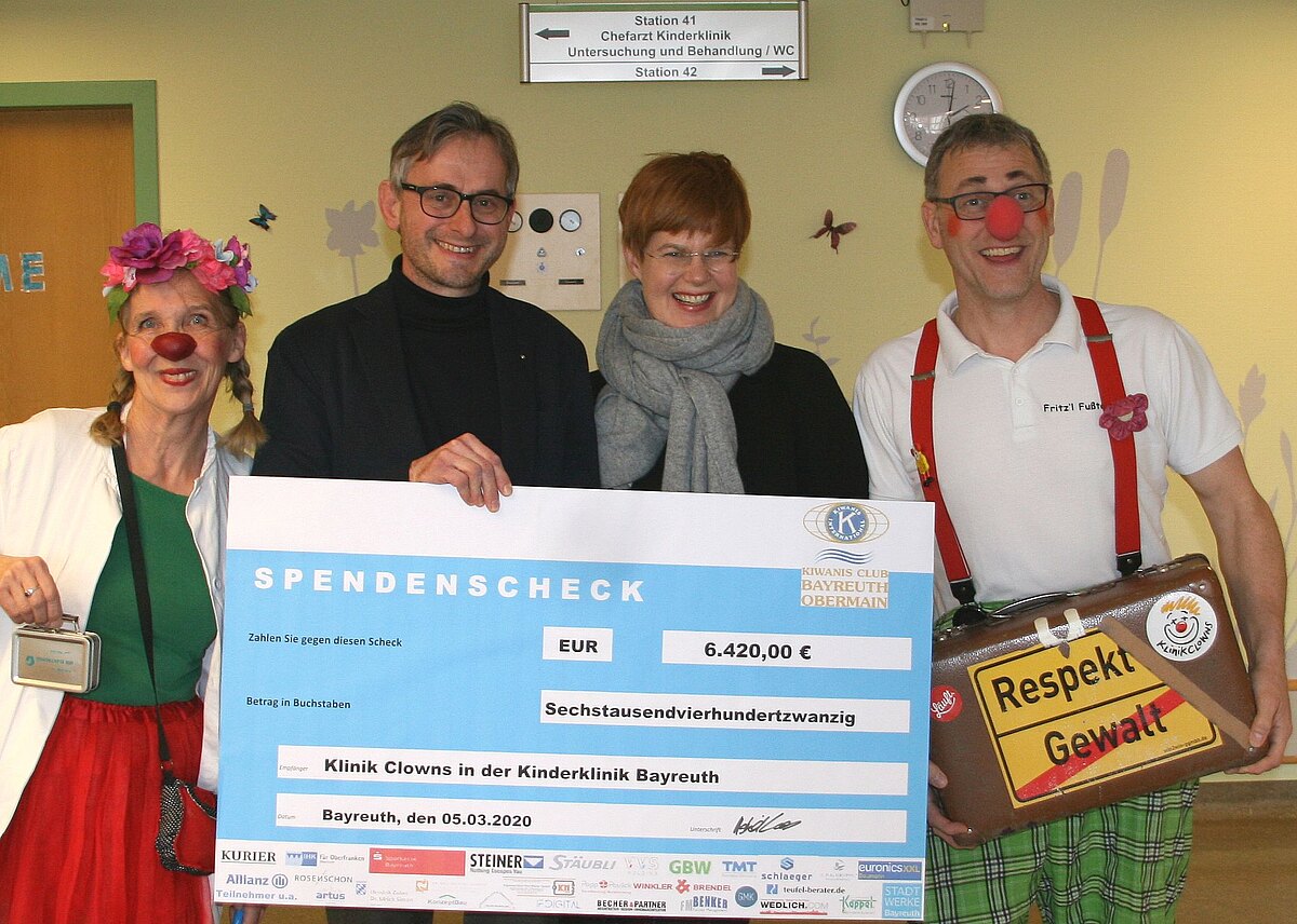 Rund 60 Firmen, Institutionen, Handwerker, Praxen und Privatpersonen spendierten ihren Mitarbeitern und Kunden zum Rosenmontag Krapfen für den guten Zweck. 3792 Stück, gebacken von der Gesesser Landbäckeri, wurden verkauft – und so nahm der Kiwanis Club Bayreuth-Obermain satte 6420 Euro ein. Kiwanis-Präsidentin Astrid Loos und Schatzmeister Markus Keil übergaben die Spende jetzt an den Verein Klinik-Clowns. „Wir im Club finden es einfach toll, dass es die Clowns gibt und dass sie die Kinder aufmuntern“, sagt Astrid Loos. „Trudi Eierfelck“ und „Prof. Dr. Fritzl Fußtabs“ besuchen regelmäßig Kinder, die im Klinikum Bayreuth behandelt werden. Die beiden Clowns nahmen die Spende entgegen.
