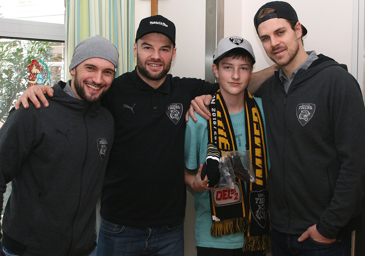Sie kamen mit Base-Caps und Fan-Schals, mit Mützen, Pucks und Mini-Trikots: Tim Richter, Michael Bartosch und Henry Martens aus der DEL-2-Mannschaft der Bayreuth Tigers besuchten jetzt junge Patienten in der Klinik für Kinder und Jugendliche der Klinikum Bayreuth GmbH. „Wir wollen den Kids eine kleine Freude in der Vorweihnachtszeit machen“, sagte Tigers-Geschäftsführer Matthias Wendel. Und das ist ihnen gelungen. Simon (13) freute sich über den unerwarteten Besuch und die Geschenke sehr. Die Partnerschaft zwischen dem Bayreuther Eishockey-Team und der Klinik für Kinder und Jugendliche besteht bereits seit längerem. Mindestens einmal im Jahr besuchen die Tigers junge Patienten. Und die nächste gemeinsame Aktion steht bereits vor der Tür: Das Spiel am zweiten Weihnachtsfeiertag, 26. Dezember ab 18.30 Uhr, gegen den EC Bad Nauheim rückt die Patientinnen und Patienten der Klinik für Kinder und Jugendliche ins Blickfeld der Eishockey-Fans. Alle Spenden, die an diesem Abend gesammelt werden, kommen der Klinik zugute.