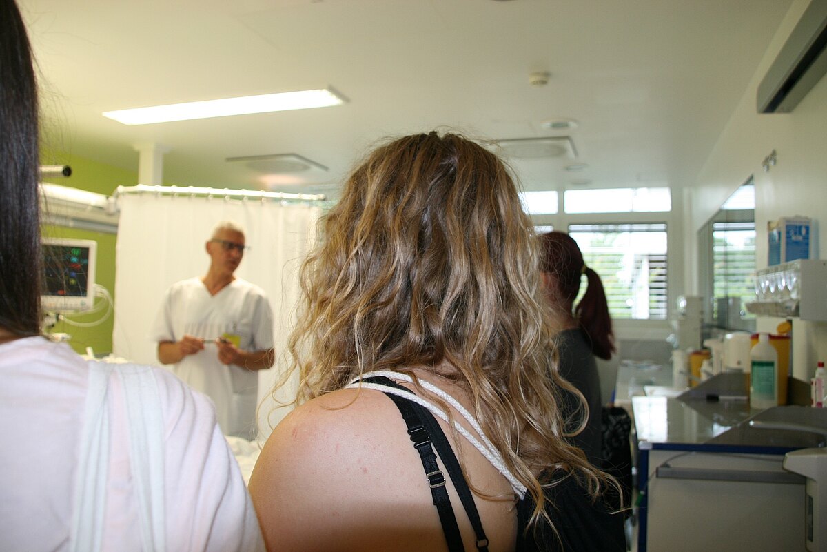 Und plötzlich ist es mucksmäuschenstill: In dem Abteil der Intensivstation 18 der Klinikum Bayreuth GmbH liegt ein Patient. Er hatte einen schweren Motorradunfall, am Tag zuvor hat ihn der Oberarzt der Klinik für Unfall- und Wiederherstellungschirurgie, Dr. Christian Haag, operiert. Heute stehen Schülerinnen und Schüler des Markgräfin-Wilhelmine-Gymnasiums an seinem Bett. Erleben hautnah, wie schnell ein Unfall einfach alles verändern kann.