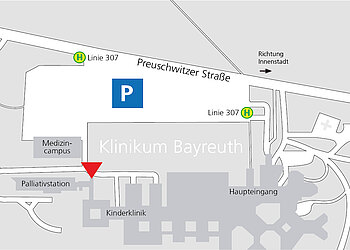 Klinikum Bayreuth, Preuschwitzer Str. 101, Eingang Verwaltung, Richtung Palliativstation