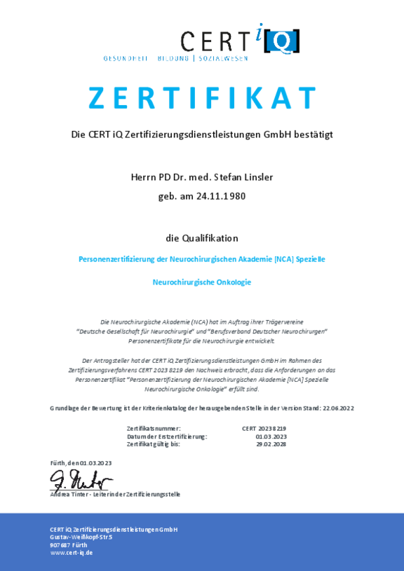 - Masterzertifikat der Deutschen Gesellschaft für Wirbelsäulenchirurgie (Prof. Linsler)