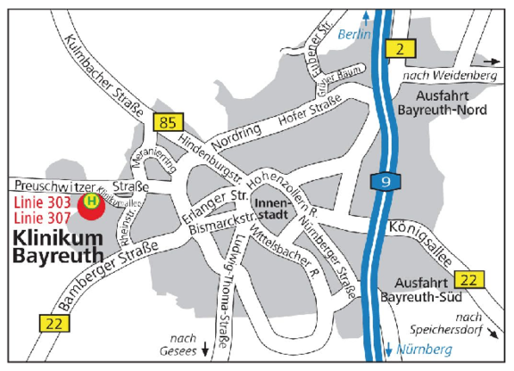 Die Klinik für Neurochirurgie und pädiatrische Neurochirurgie befindet sich in der Betriebsstätte Hohe Warte sowie Klinikum Bayreuth. Zur Aufnahme begeben Sie sich bitte in eines der mit "Patientenaufnahme" ausgeschilderten Büros in der Eingangshalle im Erdgeschoss. Ihre Aufnahme erfolgt dann auf der Neurochirurgischen Station 6A Hohe Warte oder auf der Station 25 im Klinikum. In unserer Klinik stehen Ihnen Zweibett- und Einbettzimmer zur Verfügung. Alle Zimmer sind mit eigenem WC, Dusche, TV, Telefon und Privatsafe ausgestattet. Dabei besteht möglicherweise eine Zuschlagspflicht.