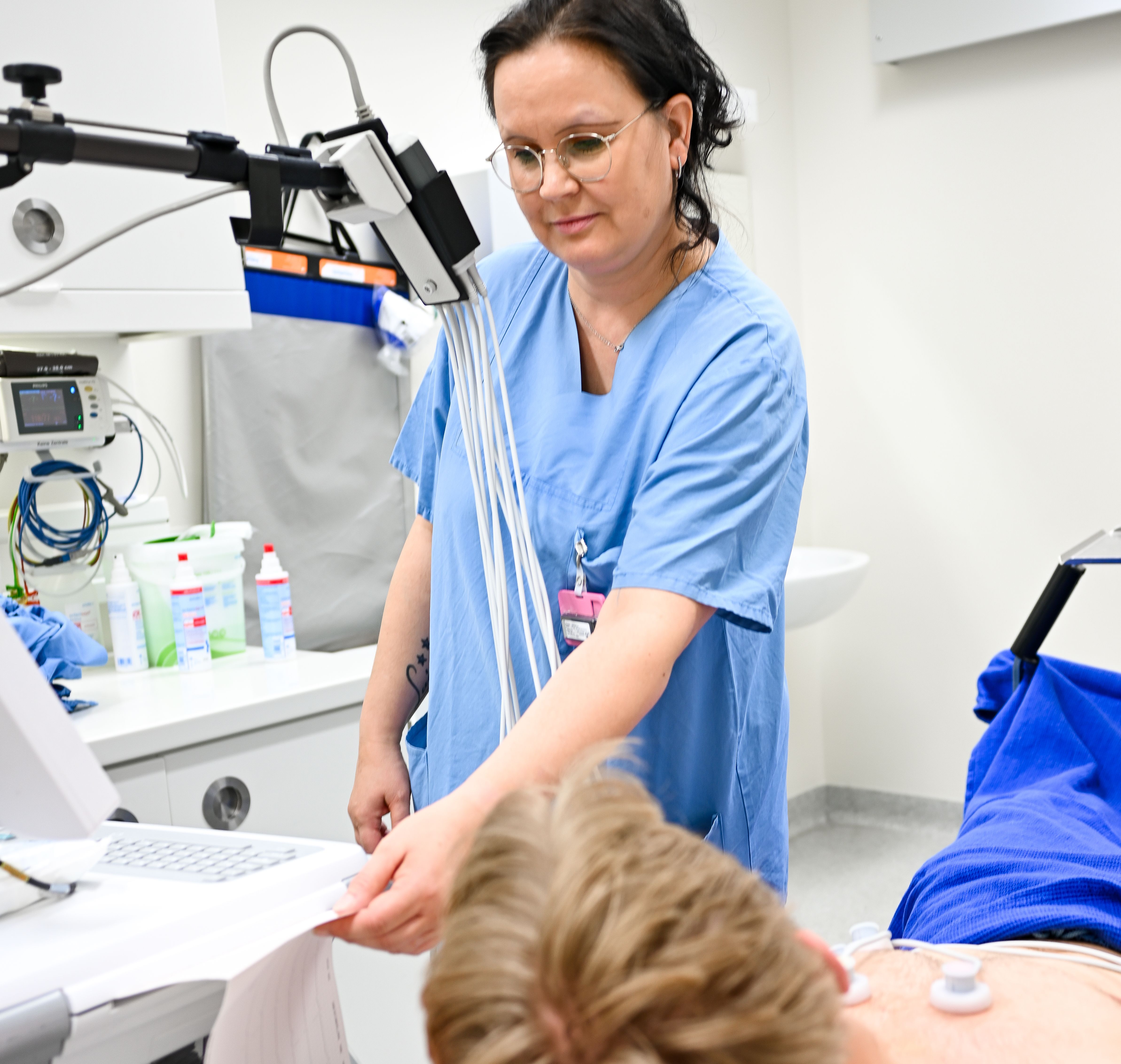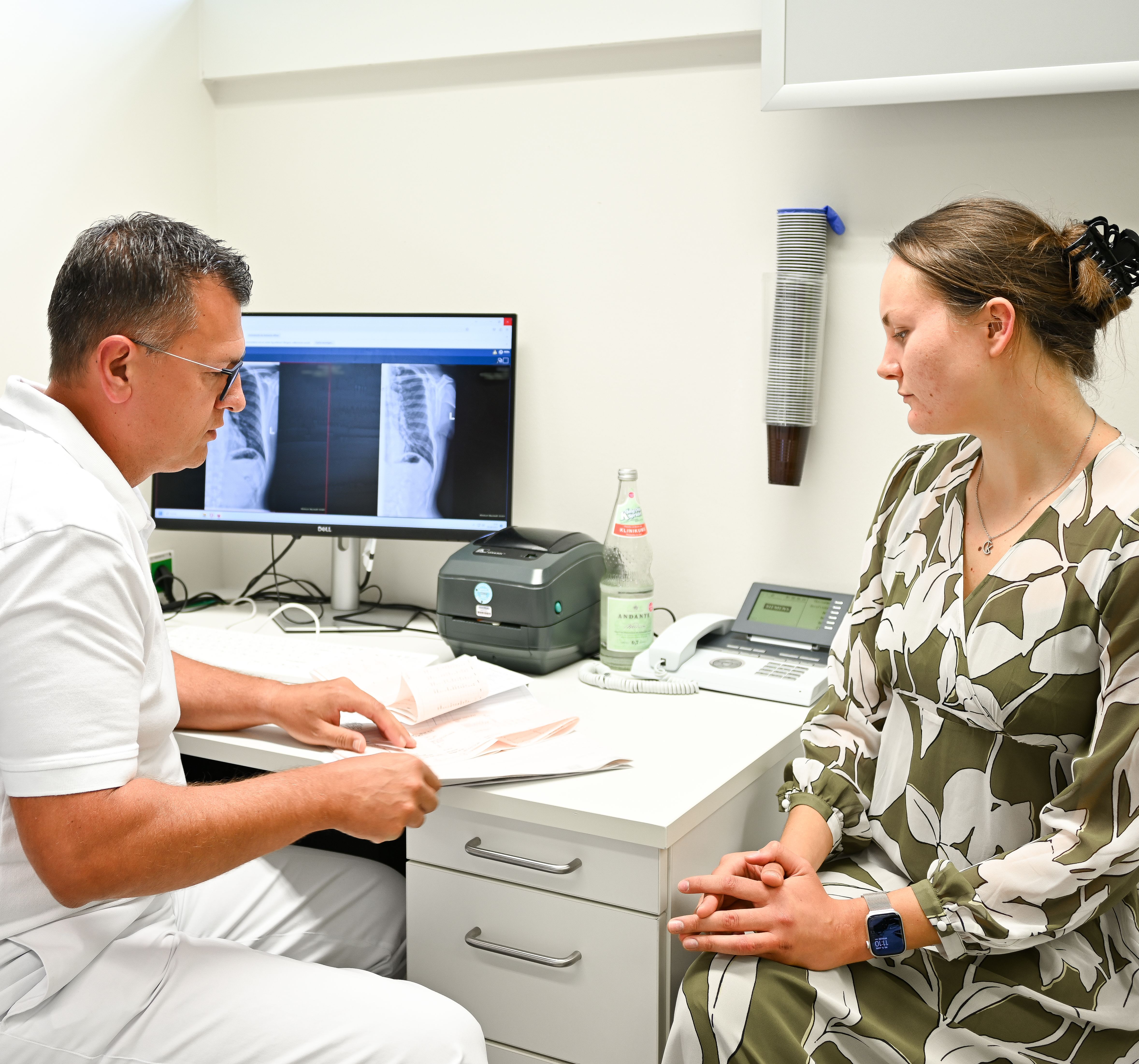 Arztgespräch und Diagnostik: Etwa zwei Stunden dauert es, bis die Ergebnisse der Blutuntersuchung vollständig vorliegen. Parallel dazu oder auch davon abhängig wird Ihre behandelnde Ärztin oder Ihr behandelnder Arzt weitere Untersuchungen in die Wege leiten (z.B. Röntgen, Ultraschall, Computertomografie). Nach einer Übergabe werden Sie in einen der Behandlungsbereiche (konservativ, operativ oder Schockraum) von der Pflegekraft übernommen und bis zur Entlassung oder Verlegung pflegerisch betreut. Unterstützt wird die Fachkraft ggf. von Krankenpflegefachhelfenden, Auszubildenden und studentischen Hilfskräften.